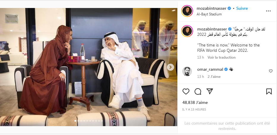 وشاركت الشيخة موزا عبر حسابها على إنستغرام صورة لها بجوار زوجها أمير قطر السابق الشيخ حمد بن خليفة، وكتبت: “لقد حان الوقت، مرحبًا بكم في بطولة كأس العالم قطر 2022″.