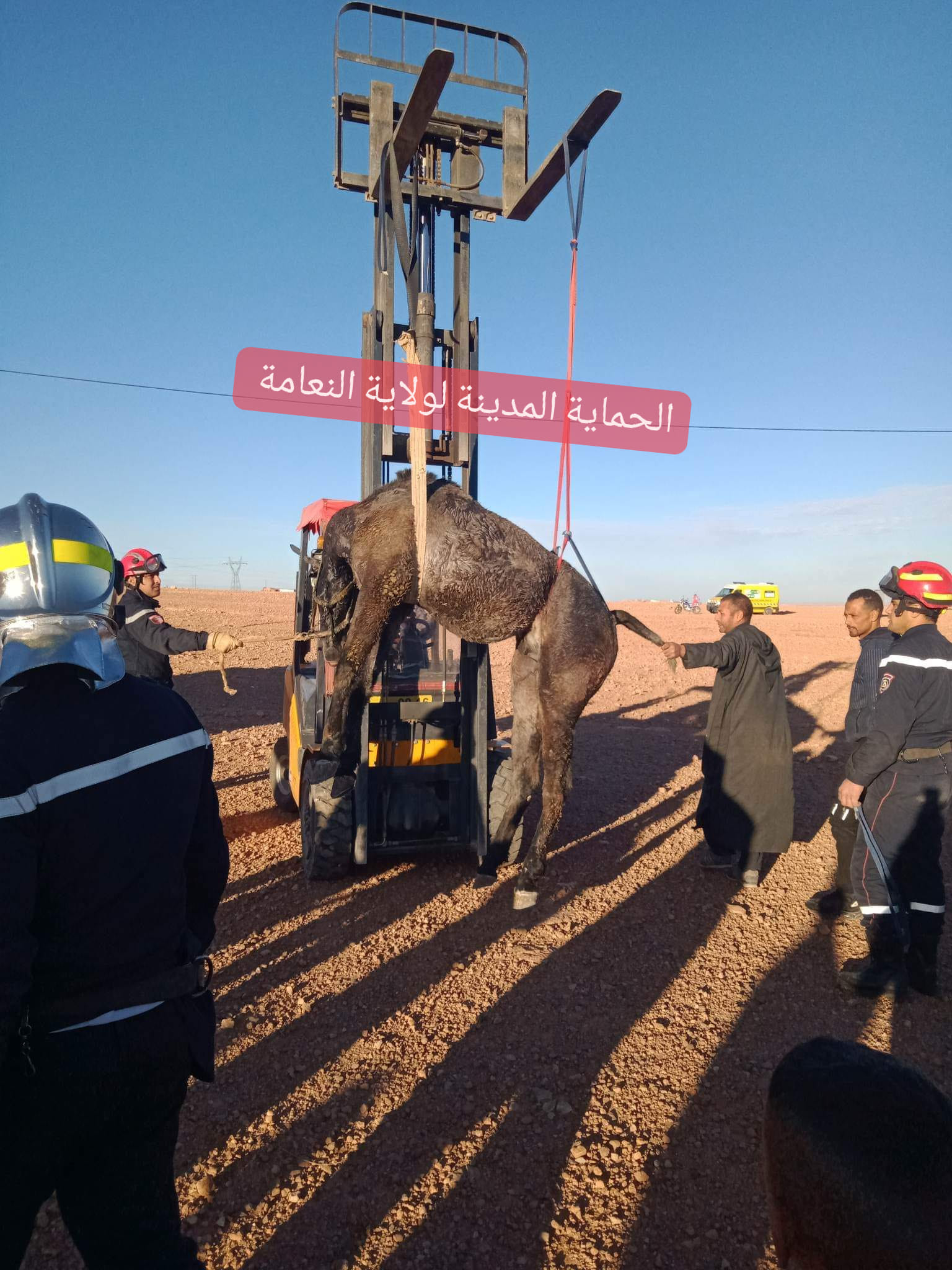 كما استخدمت في عملية الإنقاذ شاحنة خاصة، وسيارة إسعاف، قبل النجاح في إخراج الحصان في حدود الساعة 15:40 مساء.