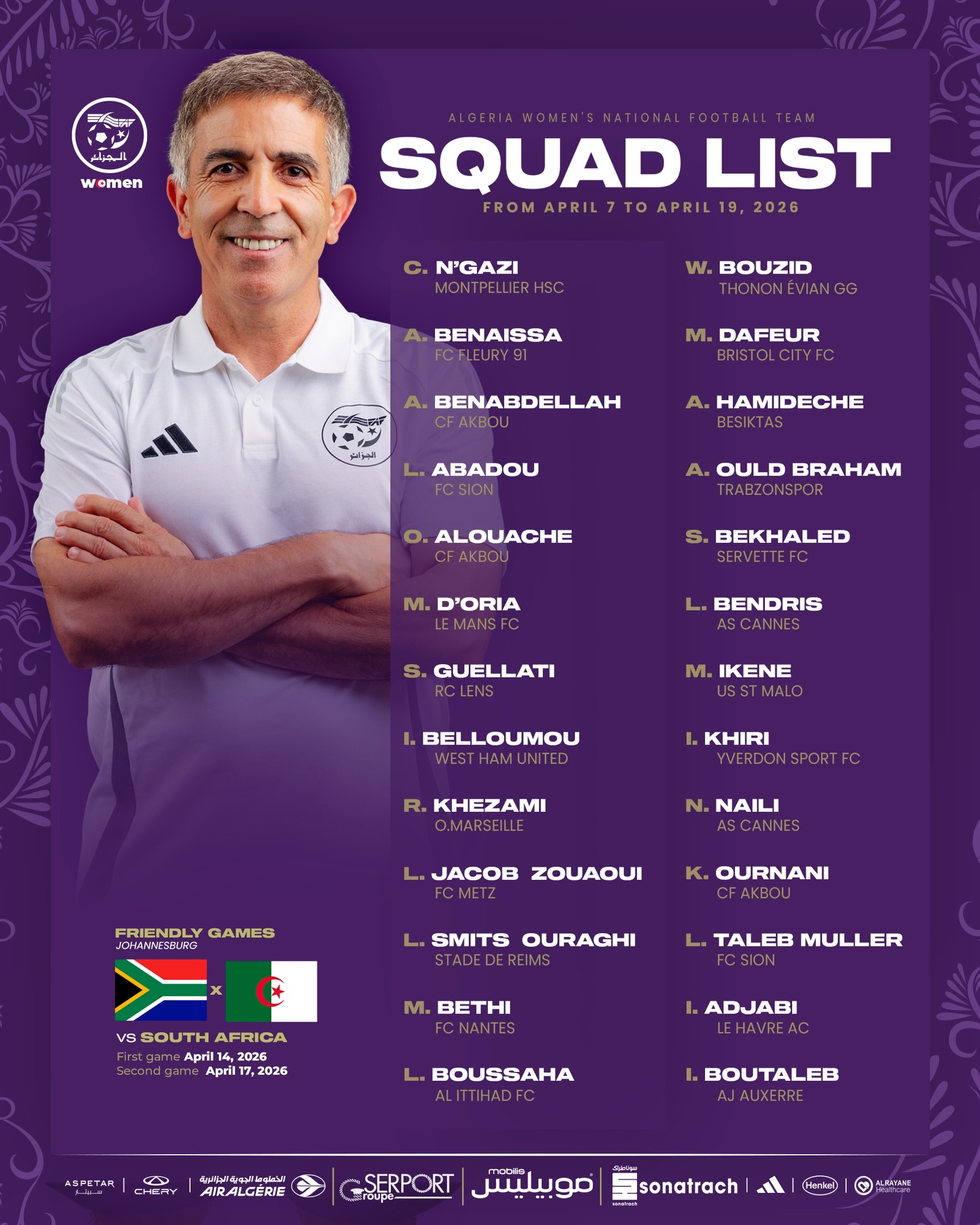 وكان المدرب فريد بن ستيتي قد أعلن الاثنين الماضي، عن قائمة اللاعبات تحسبا للمبارتين الوديتين، وهي القائمة التي ضمت 26 لاعبة.