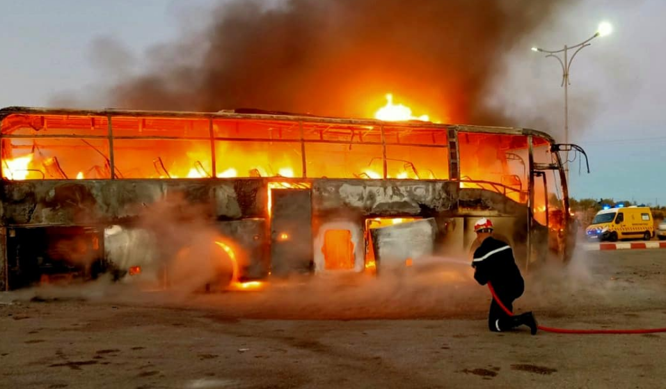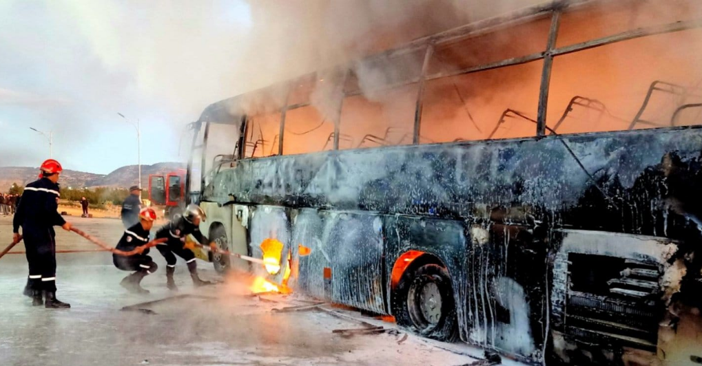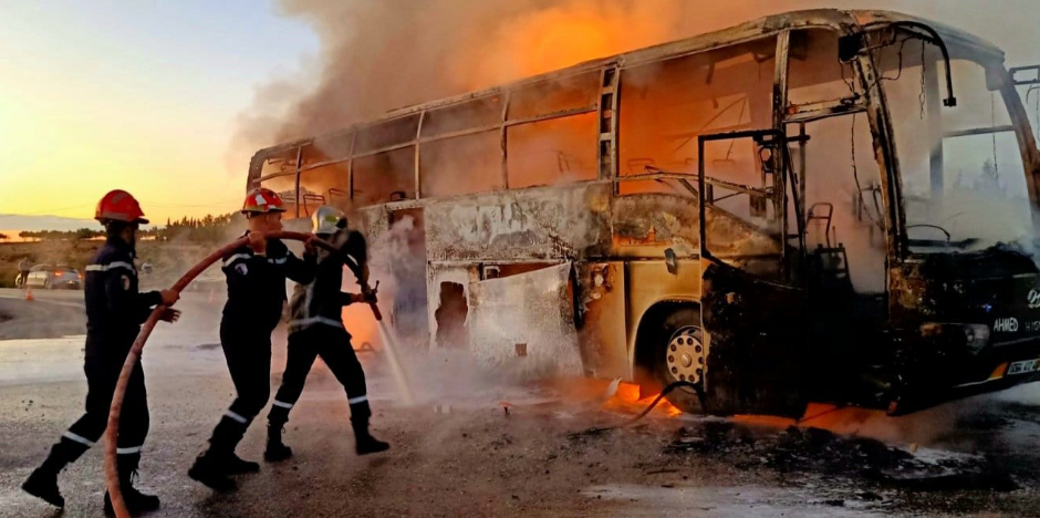 بالصور.. نشوب حريق في حافلة لنقل المسافرين بتيارت