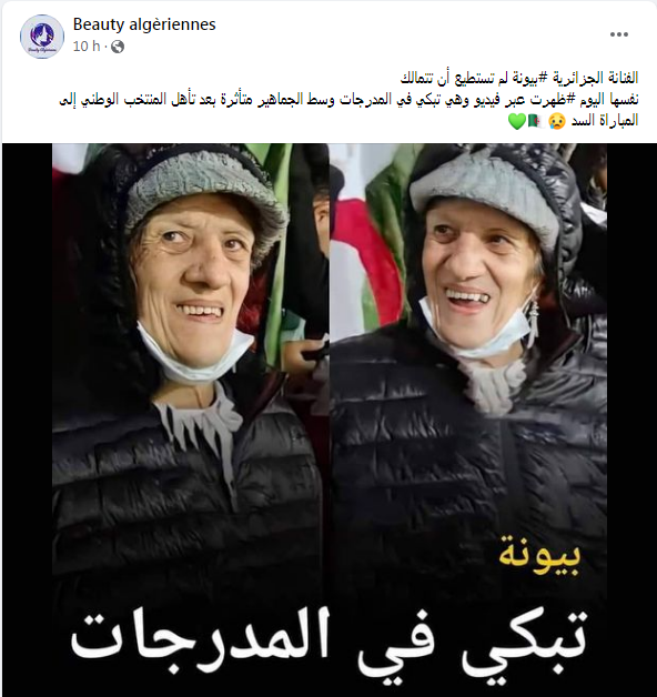 تداول ناشطون على مواقع التواصل الاجتماعي مقطعا مصورا للفنانة الجزائرية بيونة وهي تبكي بتأثر في ملعب مصطفى تشاكر بعد تأهل الخضر للدور الفاصل.