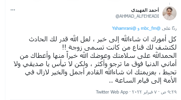 هدوء: افقت من الغيبوبة بعد ستة أشهر ولم أجد زوجتي واكتشفت أنها خلعتني#بعد_المنتصف @Yshamrani#MBCFM pic.twitter.com/p9Rlws6WZF— #MBCFM (@mbc_fm) February 6, 2022