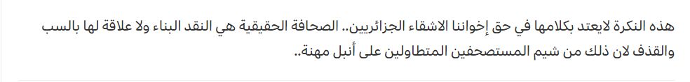 وتداول نشطاء جزائريون المقطع المصور بعدما قضوا ليلتهم في البحث عبر شبكات التواصل الاجتماعي عن ردة فعلها كونهم كانوا متأكدين بأنها لن تفوت فرصة التشفي ونفث السموم، خاصة بعدما تجرعت مرارة فوز الجزائر بكأس العرب.