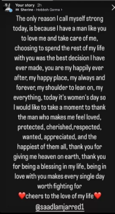 وقالت في ستوري خاص: “السبب الوحيد الذي جعلني أسمي نفسي قوية هو أنه عندي رجال مثلك يحبني ويعتني بي”.