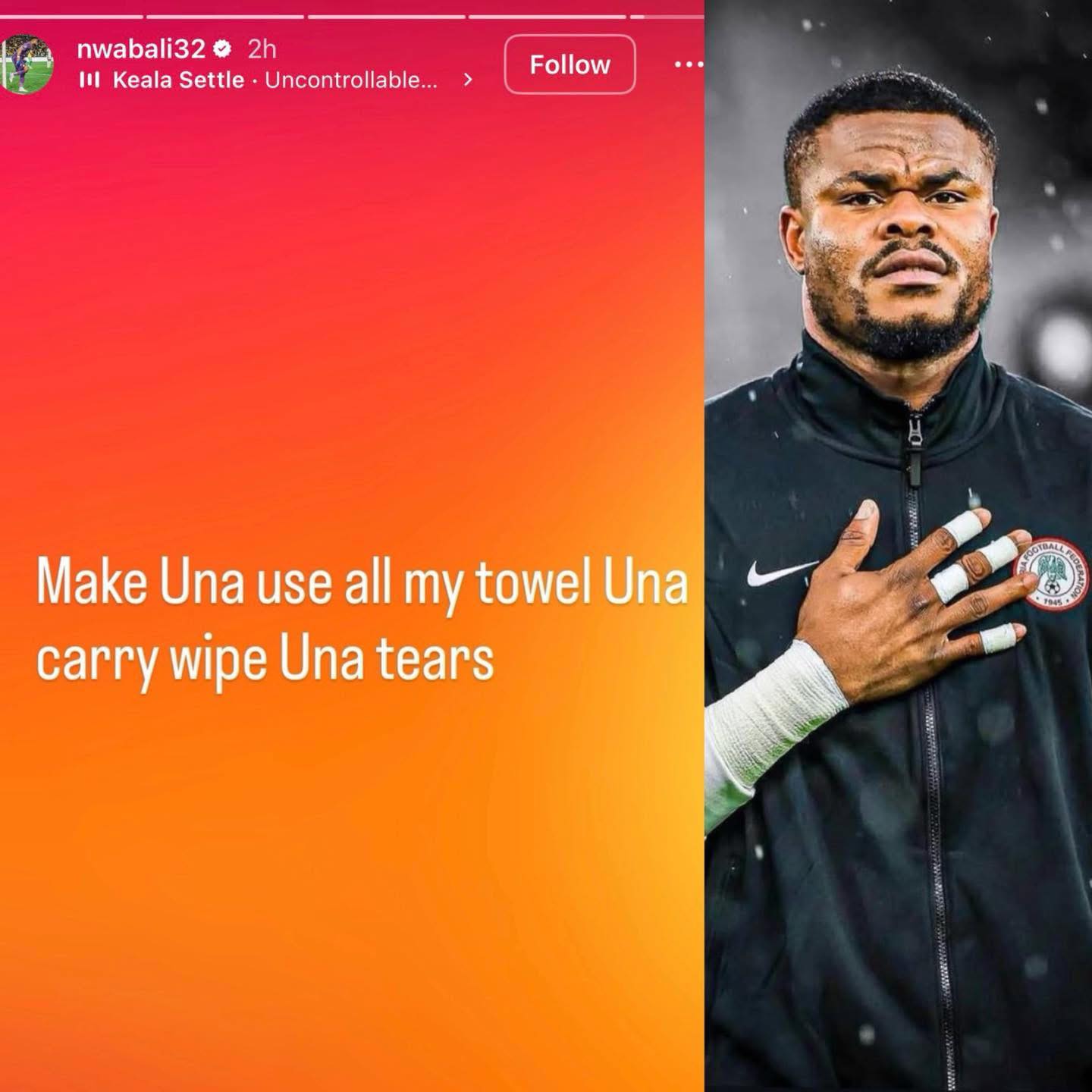 وبعد النهائي علق حارس منتخب نيجيريا، الذي ذكرته منشفة ميندي، بمنشفته التي سلبت منه في مواجهة منتخب المغرب، وقال في تعليقه عبر ستوري: “الآن يمكنكم استعمال منشفتي لمسح دموعكم”.