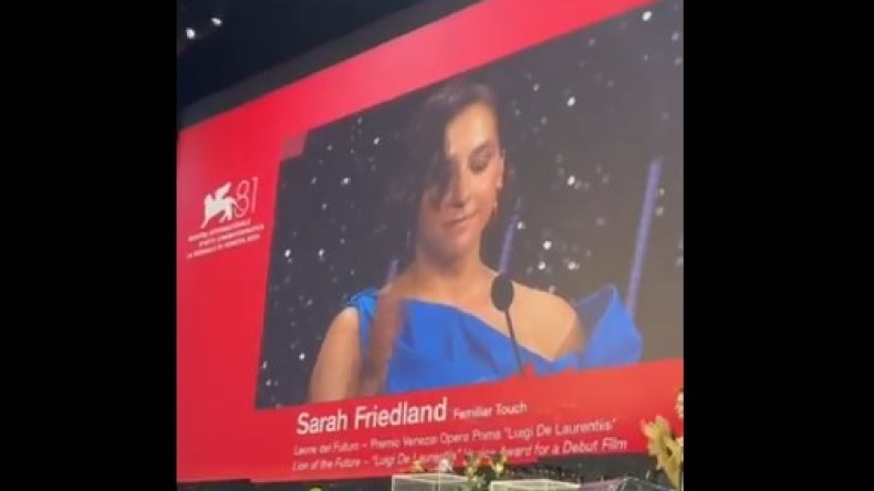 وقالت المخرجة سارة فريدلاند، على خشبة المسرح في الحفلة الختامية التي أقيمت في قصر السينما بالمدينة الإيطالية: “باعتباري فنانة يهودية أميركية، لا بد لي أن أشير إلى أنني أقبل هذه الجائزة في اليوم الـ336 للإبادة الإسرائيلية في غزة والعام الـ76 للاحتلال”.