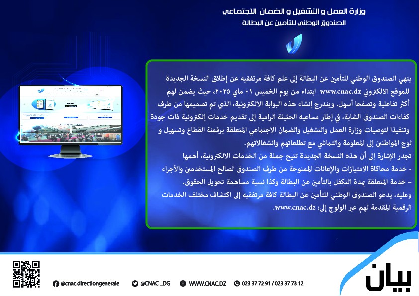 أعلن الصندوق الوطني للتأمين عن البطالة (CNAC) عن إطلاق النسخة الجديدة لموقعه الإلكتروني الرسمي http://www.cnac.dz، وذلك ابتداءً من يوم غد الخميس في إطار استراتيجيته الرامية إلى رقمنة خدماته وتبسيط الإجراءات لفائدة مرتفقيه.