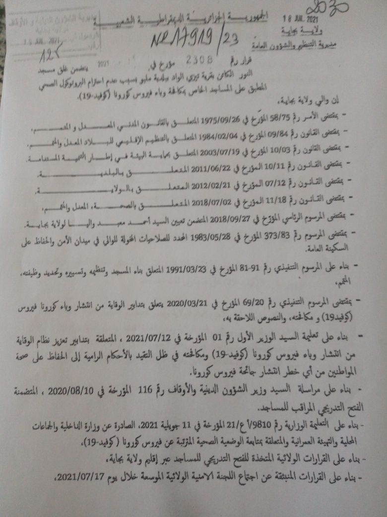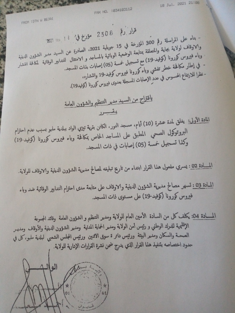 وأصدر والي بجاية، الأحد 18 جويلية، قرارا بغلق مسجد النور بـ “ملبو” لمدة 10 أيام بعد تسجيل 5 إصابات داخله جراء عدم احترام البروتوكول الصحي.
