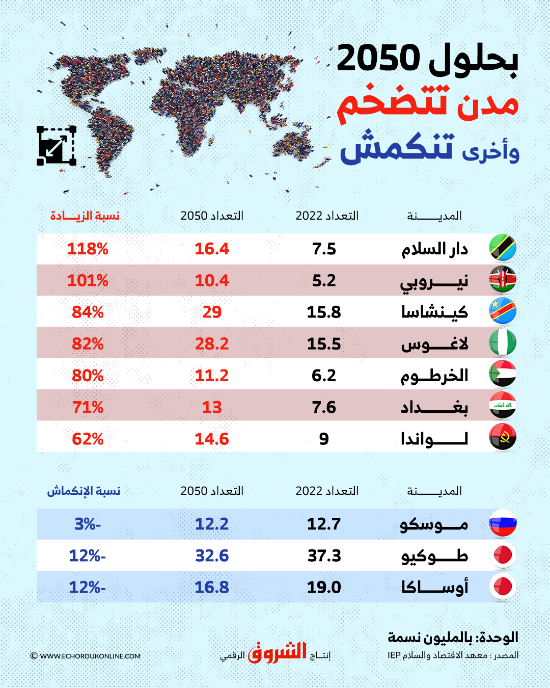 تشير توقعات معهد الاقتصاد والسلام (IEP) إلى زيادة معتبرة لعدد سكان مدن الشرق الأوسط وشمال إفريقيا بحلول سنة 2050، كما تُشير إلى زيادة سكان