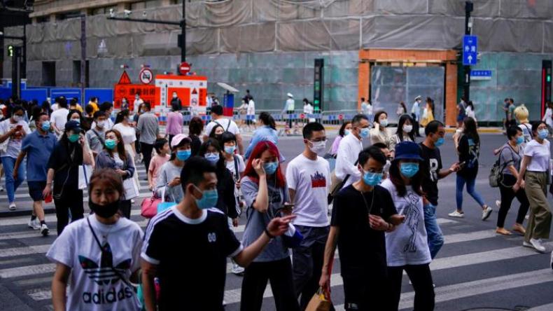 أشخاص يضعون كمامات يسيرون في أحد شوارع شنغهاي يوم 25 ماي 2020