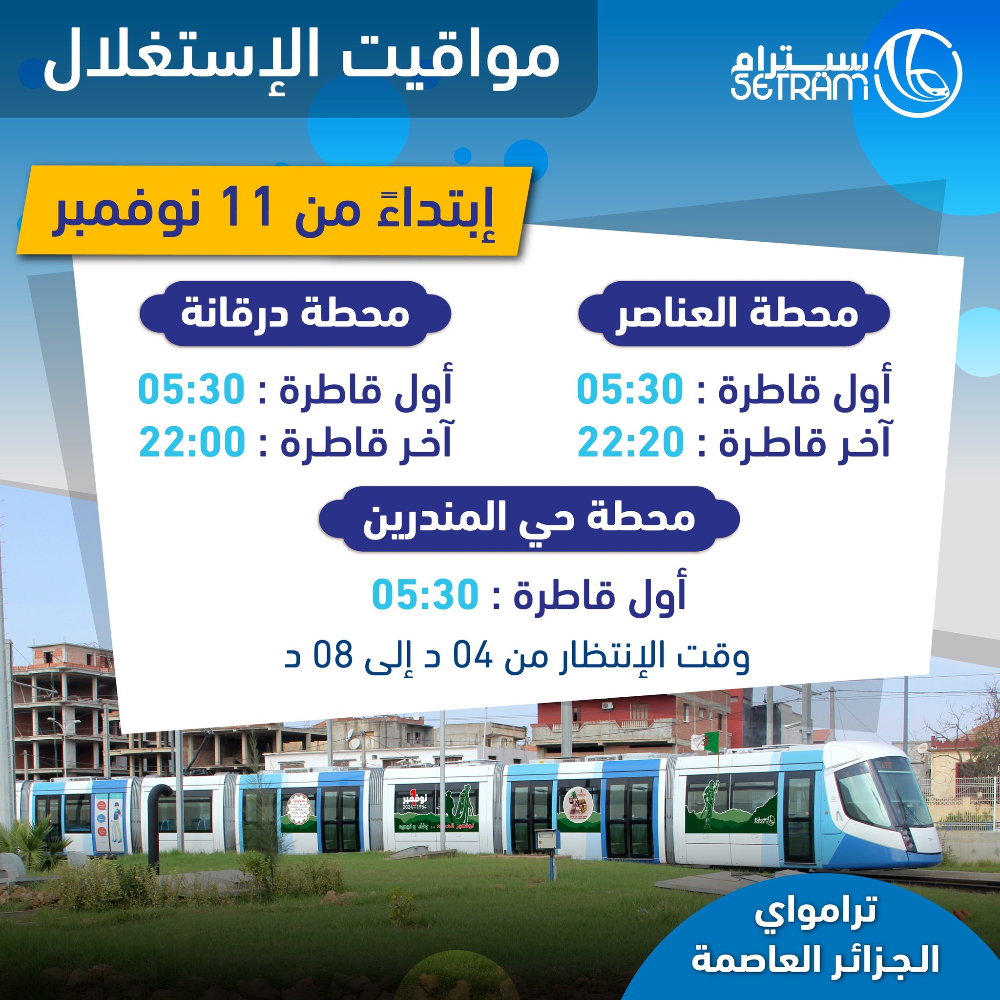 أعلنت شركة سيترام الجزائر العاصمة، عن تغيير في مواقيت استغلال الترامواي بداية من اليوم الثلاثاء 11 نوفمبر.