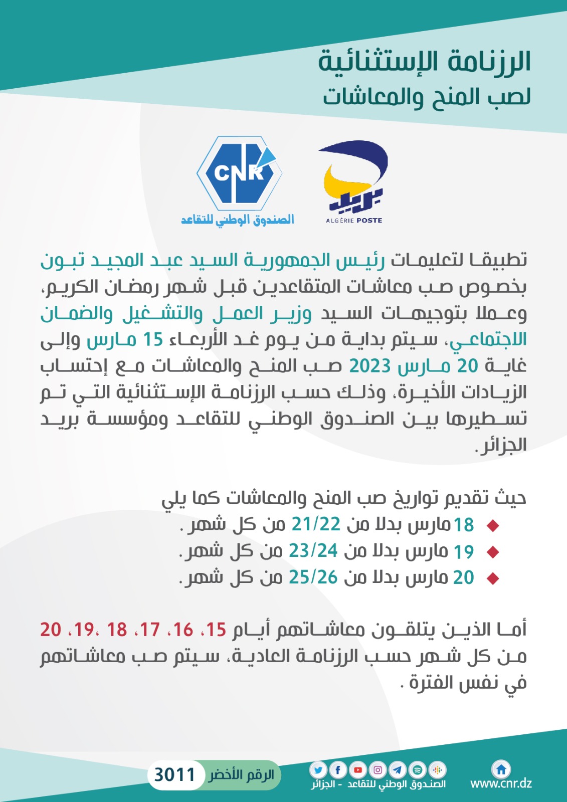 تطبيقا لتعليمات رئيس الجمهورية بخصوص صبّ معاشات ومنح المتقاعدين قبل شهر رمضان، أعلن الصندوق الوطني للتقاعد يوم الثلاثاء عن الشروع في العملية بدء من الأربعاء 15 مارس.