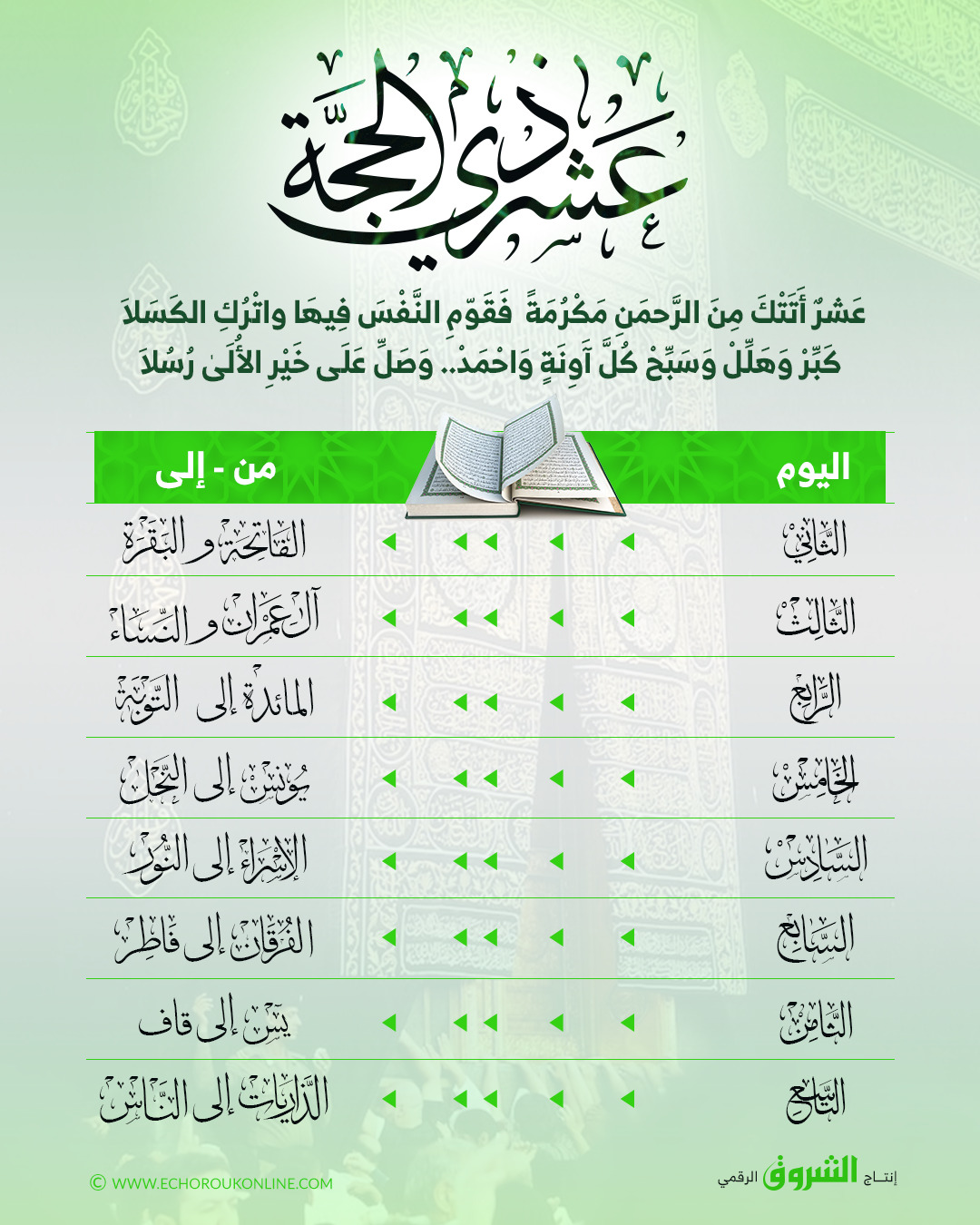 في الإنفوجراف نقدم برنامج لقراءة كتاب الله كاملا في هذه الأيام المباركات..