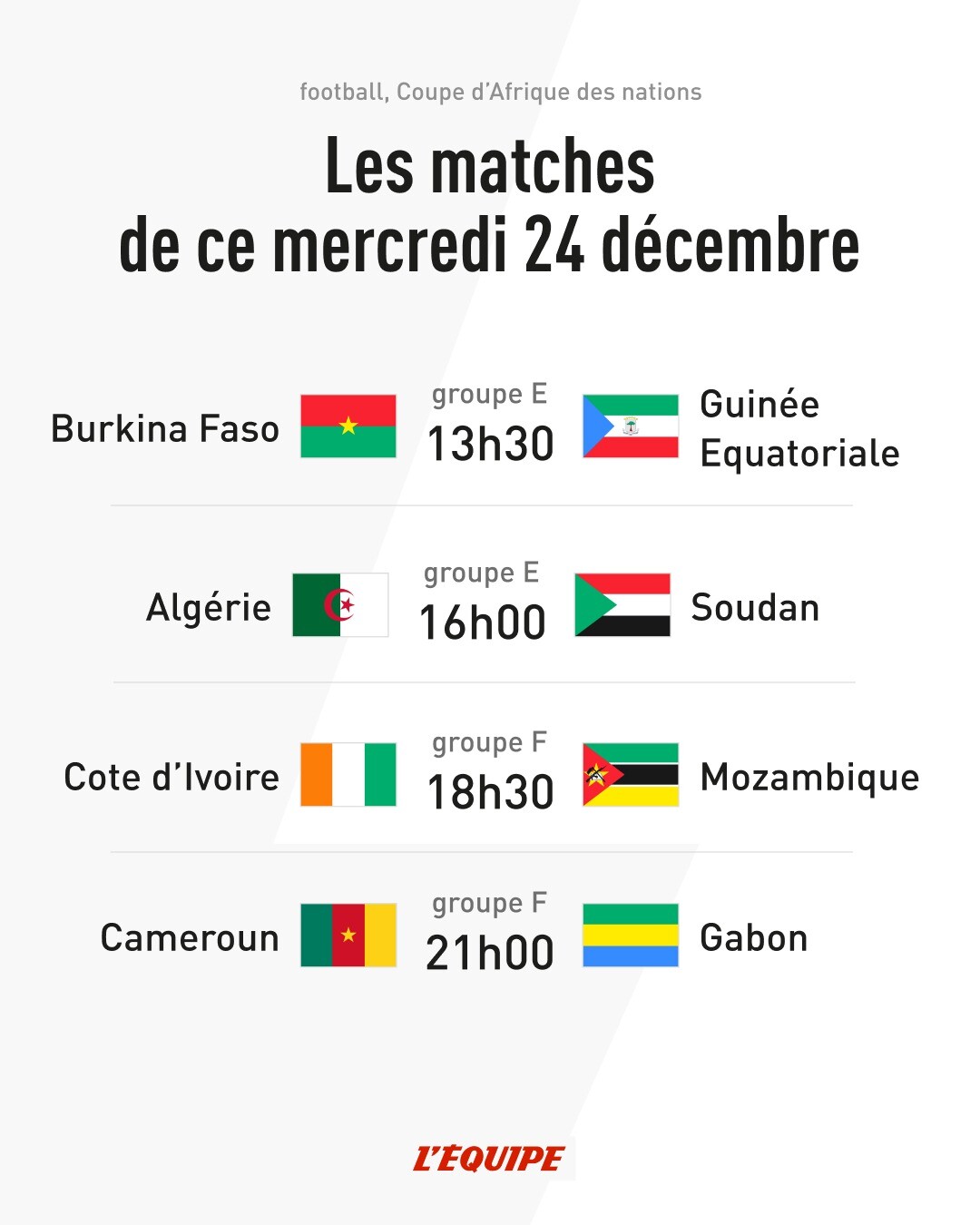 أما اللقاء الأخير من الجولة الأولى، فسيجمع بين الكاميرون والغابون، وسينطلق على الساعة التاسعة ليلا.