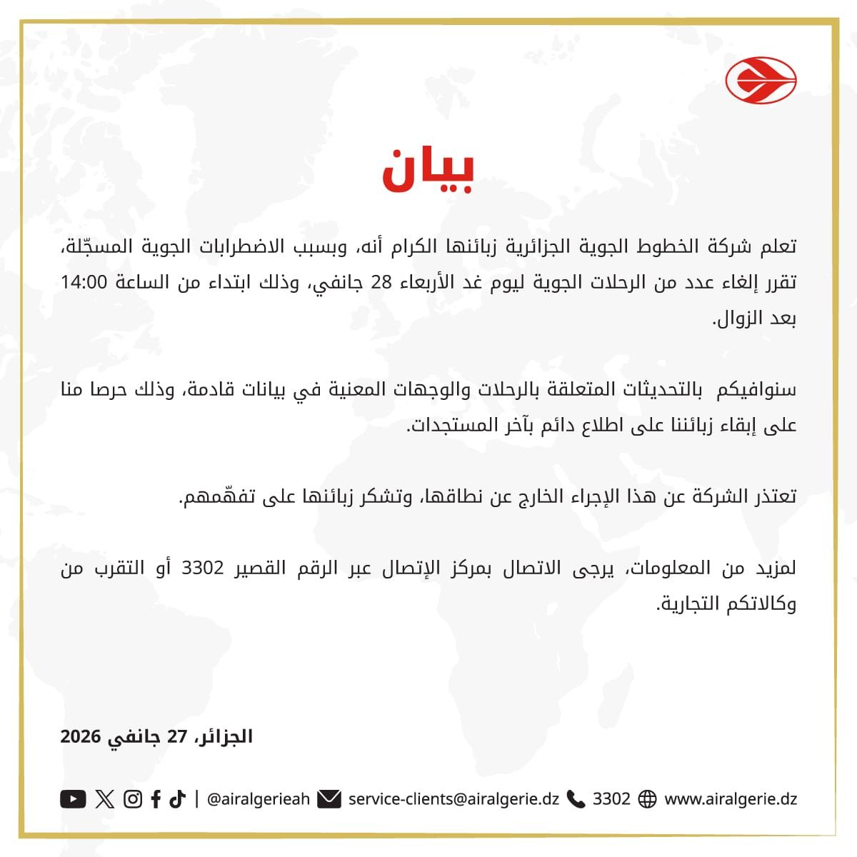أعلنت شركة الخطوط الجوية الجزائرية عن إلغاء عدد من الرحلات الجوية لليوم الأربعاء، ابتداءً من الساعة 14:00 بعد الزوال، نتيجة الاضطرابات الجوية المسجلة.