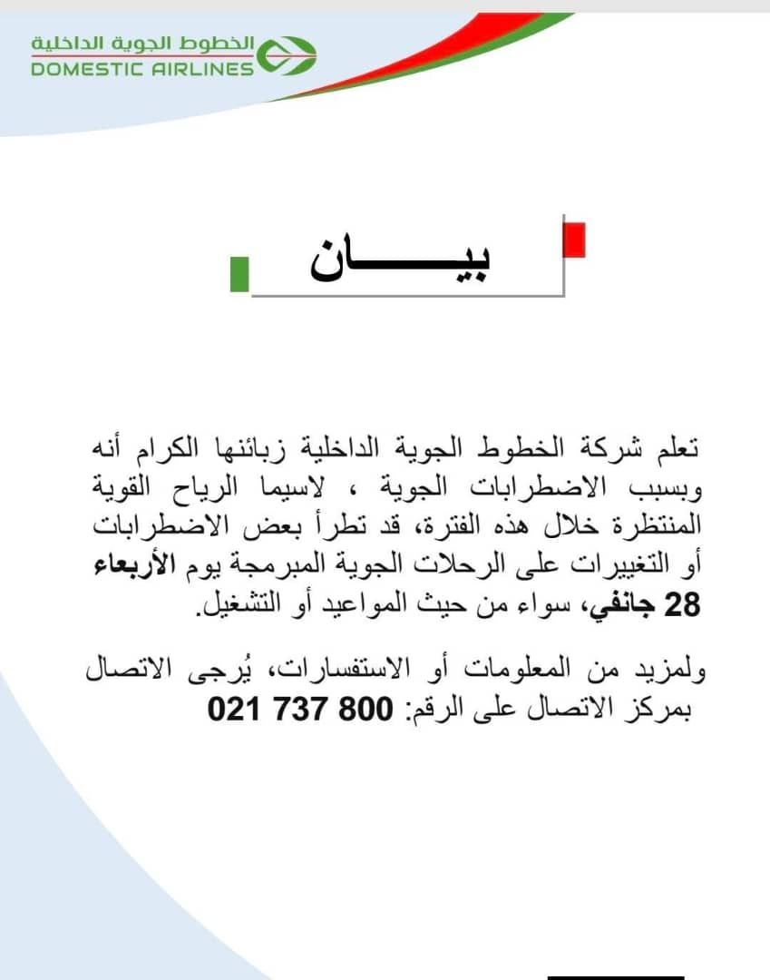 من جهتها، نوهت شركة الخطوط الجوية الداخلية من احتمال حدوث اضطرابات أو تغييرات على الرحلات الجوية المبرمجة اليوم الأربعاء، لاسيما بسبب الرياح القوية المتوقعة خلال هذه الفترة، سواء من حيث المواعيد أو التشغيل.
