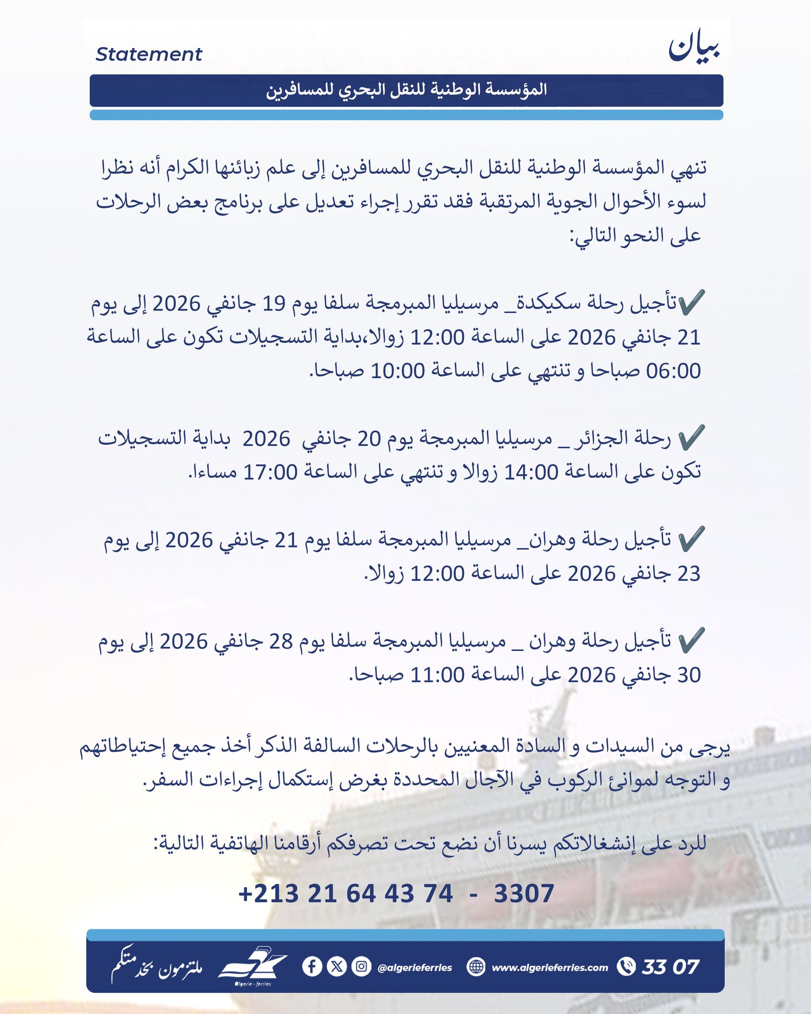 أعلنت المؤسسة الوطنية للنقل البحري للمسافرين، عن تأجيل ثلاث رحلات بحرية مبرمجة خلال شهر جانفي الجاري، وذلك بسبب سوء الأحوال الجوية.