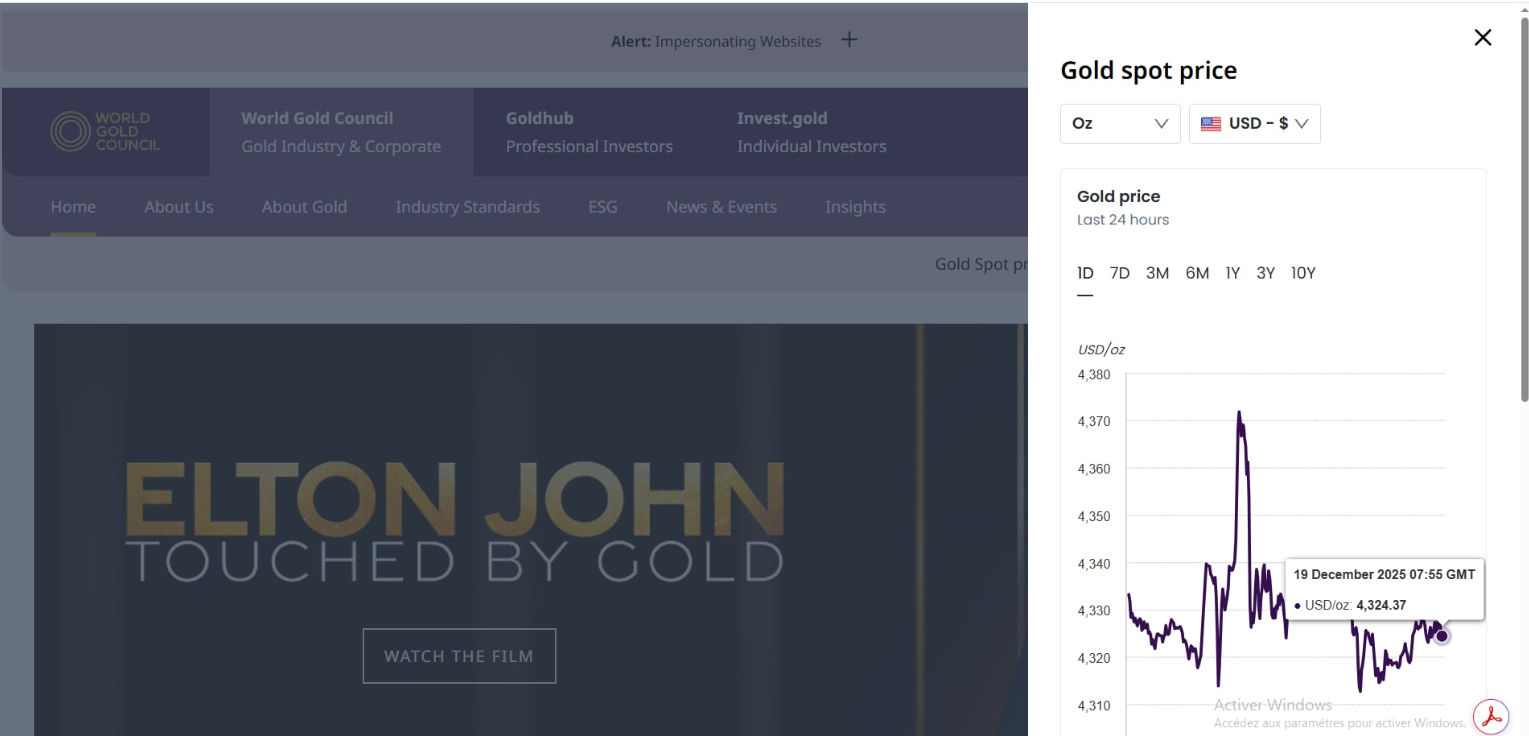 وحسب بيانات مجلس الذهب العالمي، بلغ سعر أوقية (أونصة) الذهب خلال التعاملات الفورية اليوم الجمعة 4324 دولارا بانخفاض قدره 47 دولارا عن أفضل سعر حققه الذهب خلال تعاملات الخميس.