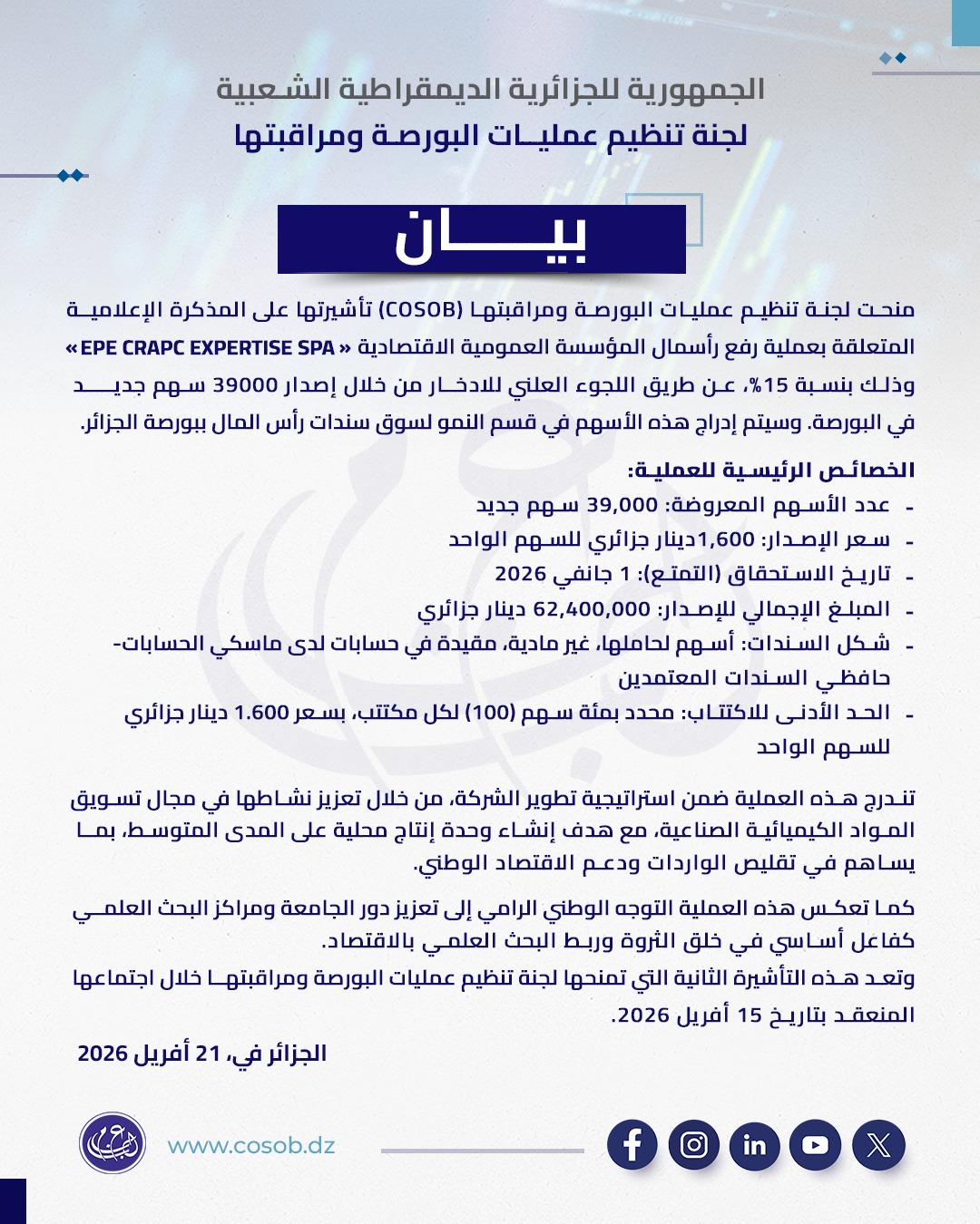 منحت لجنة تنظيم عمليات البورصة ومراقبتها “كوسوب”، الثلاثاء، تأشيرتها على المذكرة الإعلامية الخاصة بعملية رفع رأسمال المؤسسة العمومية الاقتصادية “EPE CRAPC EXPERTISE SPA” بنسبة 15%، من خلال اللجوء العلني للادخار عبر إصدار 39 ألف سهم جديد في بورصة الجزائر، على أن يتم إدراجها في قسم النمو لسوق سندات رأس المال.