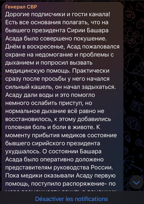 الترجمة: “أعزائي المشتركين وضيوف القناة! هناك كل الأسباب التي تدعو إلى الاعتقاد بحدوث محاولة لاغتيال الرئيس السوري السابق بشار الأسد. وبعد ظهر يوم الأحد، اشتكى الأسد للأمن من شعوره بالإعياء وصعوبة في التنفس وطلب طلب المساعدة الطبية. بعد الطلب مباشرة تقريبًا، بدأ يعاني من سعال قوي وبدأ في الاختناق. تم إعطاء الأسد الماء وهذا ساعد على إضعاف الهجوم قليلاً، لكن التنفس الطبيعي لم يعد بعد، وأضيف إلى ذلك الصداع وآلام البطن. وبحلول الوقت الذي وصل فيه الأطباء، كانت حالة الرئيس السوري السابق تتدهور. تم إبلاغ ممثلي القيادة الروسية على الفور بحالة بشار الأسد. وبينما كان الأطباء يقدمون الإسعافات الأولية للأسد، صدر أمر بعلاجه في المنزل كلما أمكن ذلك وعدم وضع «المريض» في المؤسسات الطبية. وبعد تقديم الإسعافات الأولية، وصلت «تعزيزات» للأطباء، وتم إنشاء جناح للعلاج في شقة الأسد. وحتى مساء اليوم الاثنين، وبحسب الأطباء المعالجين فإن حالة بشار الأسد مستقرة ويشعر أنه بخير. وأظهرت الاختبارات التي أجريت للرئيس السوري السابق وجود آثار تعرض لمادة سامة في جسده. وكما ورد في التقرير المقدم إلى مساعد الرئيس الروسي نيكولاي باتروشيف، فإن التحقيق جار، لكن حتى الآن لم يمكن معرفة كيفية تعرض بشار الأسد للسم”.