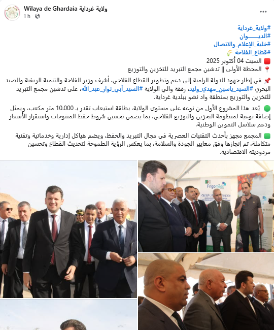 أشرف وزير الفلاحة والتنمية الريفية والصيد البحري، ياسين مهدي وليد، رفقة والي الولاية أبي نوار عبد الله، على تدشين مجمع التبريد للتخزين والتوزيع بمنطقة واد نشو ببلدية غرداية.