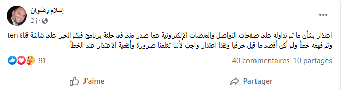 وقال الداعية إسلام رضوان، الإمام بوزارة الأوقاف المصرية في منشور له عبر صفحته على فيسبوك، اليوم: “أعتذر بشأن ما تم تداوله على صفحات التواصل والمنصات الإلكترونيةّ،عما صدر مني في حلقة برنامج “فيكم الخير” على قناة “تان” وتم فهمه خطأ ” مضيفا “لم أكن أقصد ما قيل حرفيا، وهذا اعتذار واجب لأننا تعلمنا ضرورة وأهمية الاعتذار عند الخطأ”، وفقا لموقع “المصري اليوم”.