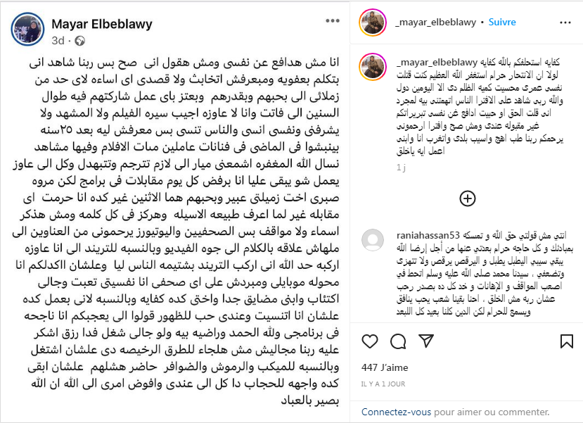 وقالت في منشور عبر حسابها على فيسبوك يوم 1 نوفمبر: “أنا مش هدافع عن نفسي ومش هقول إني صح بس ربنا شاهد إني بتكلم بعفوية ومبعرفش أتخابث ولا قصدى أي إساءة لأي حد من زملائي اللى بحبهم وبقدرهم وبعتز بأي عمل شاركتهم فيه طوال السنين الي فاتت”.