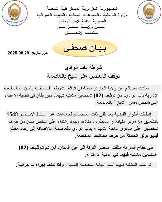 تمكنت مصالح أمن ولاية الجزائر ممثلة في فرقة الشرطة القضـائية بأمن المقاطعة الإدارية باب الوادي، من توقيف شخصين مشتبه فيهما، متورطان في قضية الاعتداء على شخص مُسن “شيخ”.