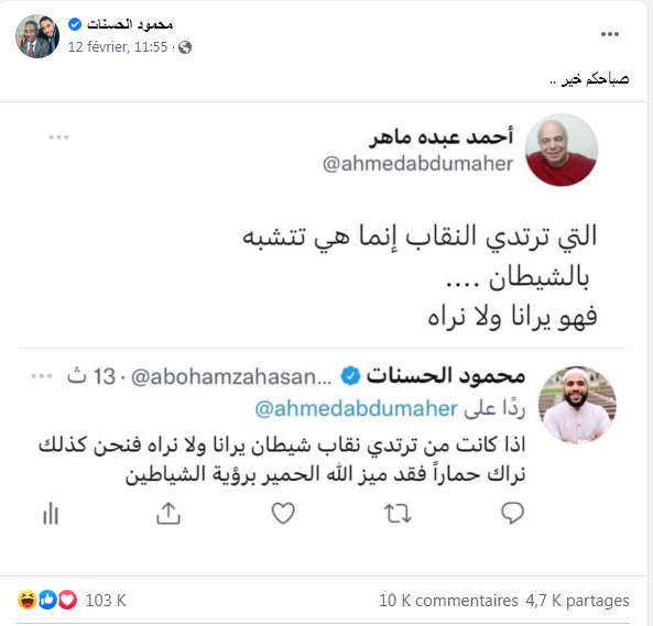 فأعاد الشيخ محمود الحسنات نشرها مع الرد: “إذا كانت من ترتدي نقاب شيطان يرانا ولا نراه فنحن كذلك نراك حماراً فقد ميز الله الحمير برؤية الشياطين”.