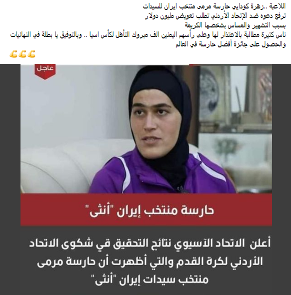 تداولت تقارير إخبارية ومواقع التواصل الاجتماعي خبر مطالبة حارسة مرمى المنتخب الإيراني للسيدات، بتعويض مالي كبير من الاتحاد الأردني لكرة القدم، بعد إثبات أنها امرأة وليست رجلا.