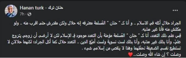 وكتبت حنان ترك تدوينة عبر حسابها على موقع فيسبوك جاء فيها: “الجراد حلال أكله في الإسلام.. وأنا كـ “حنان” المُسلمة معترفه إنه حــلال ولكن مقدرش حتى أقرب منه.. ولو مكلتش منه فأنا غير مذنبة”.
