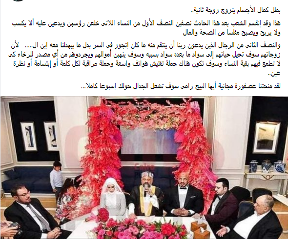وكان نشطاء قد تداولوا منذ أيام على مواقع التواصل الاجتماعي صورة لزواج بطل كمال الأجسام المصري رامي السبيعي المعروف بـ”بيغ رامي”، بزوجة ثانية، ما أثار جدلا واسعا، خاصة بانتشار خبر صدمة زوجته الأولى.