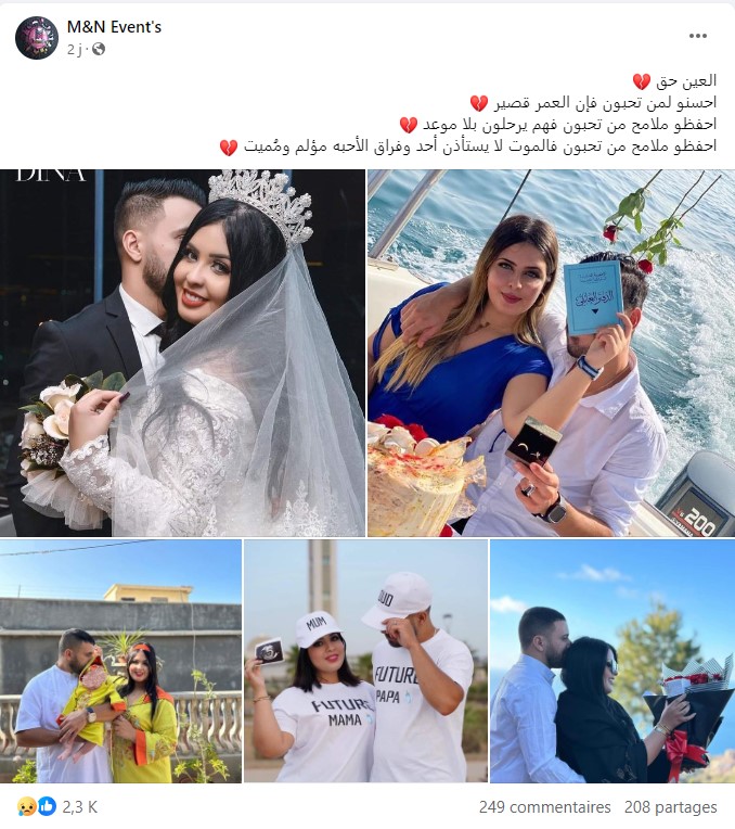 وتابعت أن زوجها توفي مغدورا بسبب الأشخاص الذين لا يجيدون السياقة، حيث كان على متن دراجته النارية حين سقط من أعلى جسر ببلدية زرالدة، مشددة على أن وجع الدنيا كله يسكن قلبها وأنها لا تستطيع مواصلة حياتها بدونه.
