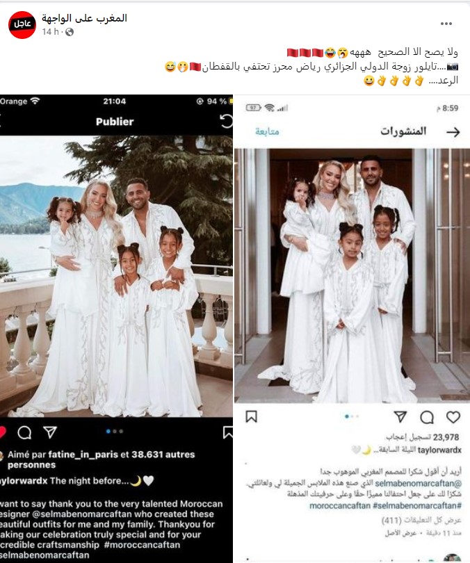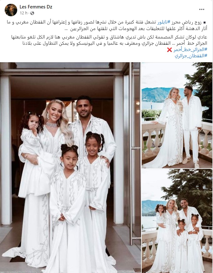 وتداول نشطاء صورا لعائلة محرز، زوجته وبناته بالقفطان مرفقة بتعليق: “زوجة رياض محرز تفتح النار على نفسها في منشور عبر انستغرام تقول فيه أن القفطان مغربي وتغلق التعليقات بسبب كثرة الانتقادات”.