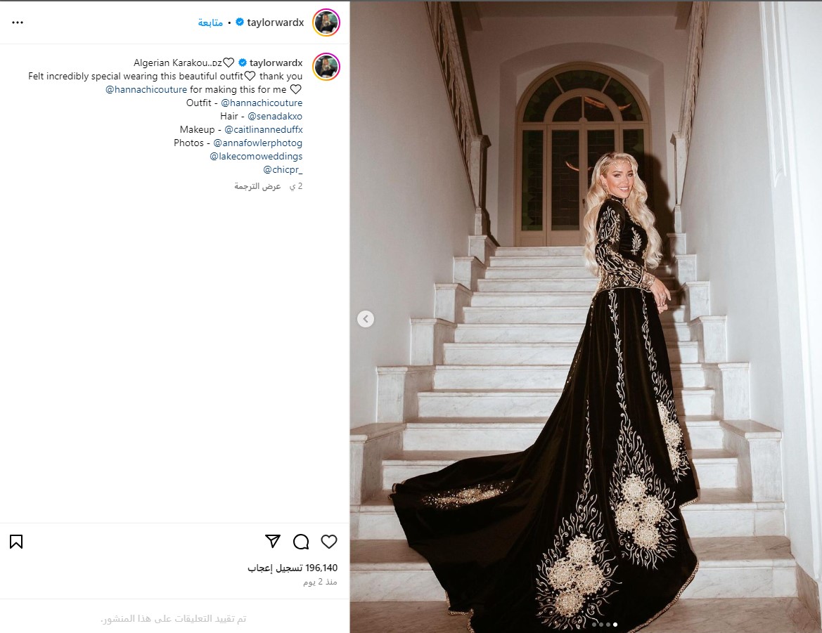 وقالت العارضة البريطانية تايلور وارد في منشور لها عبر حسابها على إنستغرام أرفقته بصور عديدة لها من حفل زفافها الأخير: “الكاراكو الجزائري.. شعرت بالتميز بشكل لا يصدق وأنا أرتدي هذا الزي الجميل.. شكراً لك @hannachicouture لصنع هذا لي”.