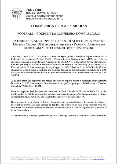قالت المحكمة الرّياضية الدولية بِمدينة لوزان السويسرية (التاس) في بيان لها، الخميس، إنها بِصدد معالجة ملفّ مقابلتَي اتحاد العاصمة ونهضة بركان المغربي.