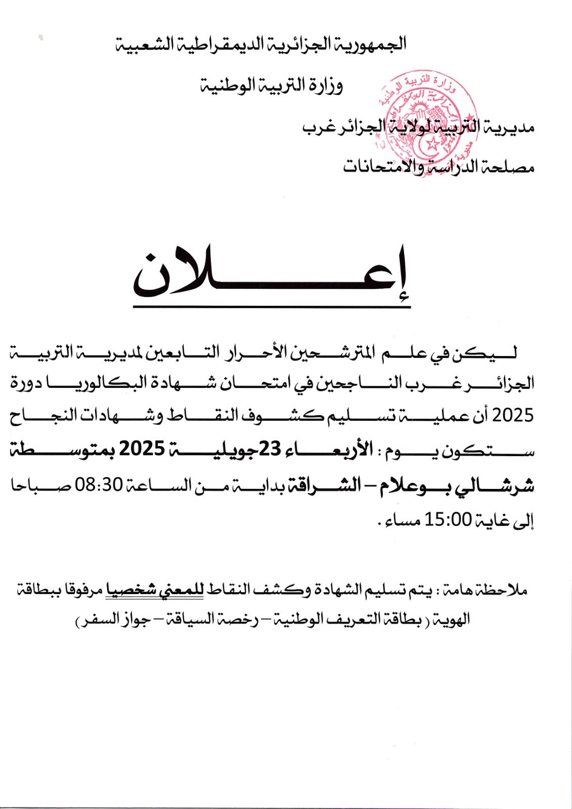 أعلنت مديرية التربية لولاية الجزائر غرب أن عملية تسليم شهادات النجاح وكشوف النقاط الخاصة بالمترشحين الأحرار الناجحين في امتحان شهادة البكالوريا دورة 2025، ستتم يوم غد الأربعاء 23 جويلية الجاري.