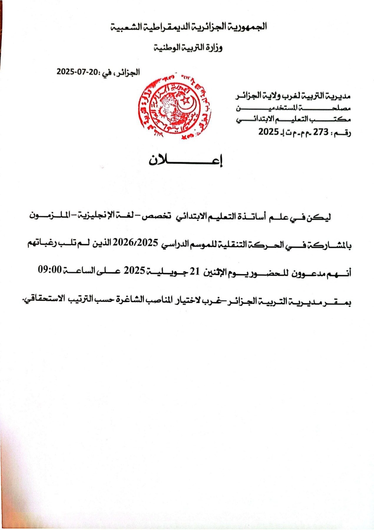 أصدرت مديرية التربية لولاية الجزائر غرب، الأحد، استدعاءً لأساتذة التعليم الابتدائي تخصص اللغة الإنجليزية الذين لم تُلبى رغباتهم في الحركة التنقلية للموسم الدراسي 2025/2026.