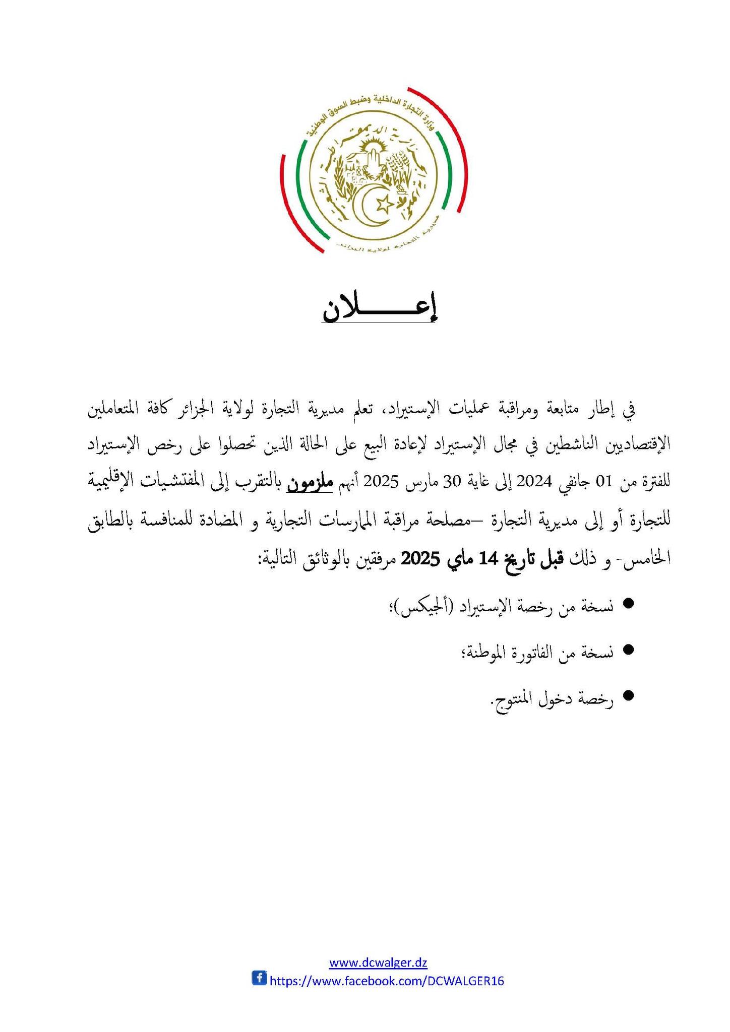 وجهت مديرية التجارة لولاية الجزائر، اليوم الأحد، بلاغًا للمتعاملين الاقتصاديين الناشطين في مجال الاستيراد لإعادة البيع على الحالة، والذين حصلوا على رخص استيراد للفترة الممتدة من 1 جانفي 2024 إلى 30 مارس 2025.