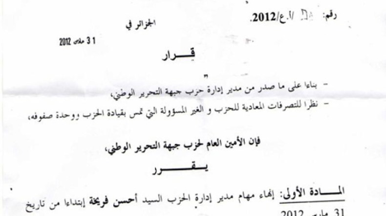 جاء في قرار الإقالة الذي تلقت الشروق اون لاين نسخة منه، الأحد، أنه “بناء على ما صدر من مدير إدارة جبهة التحرير الوطني ونظرا للتصرفات المعادية للحزب وغير المسؤولة، التي تمس بقيادة الحزب ووحدة صفوفه، فإن الأمين العام لجبهة التحرير الوطني يقرر إنهاء مهام مدير إدارة الحزب، أحسن فريخة ابتداء من تاريخ 31 مارس 2012 ويدخل القرار حيز التنفيذ ابتداء من تاريخ صدوره”.