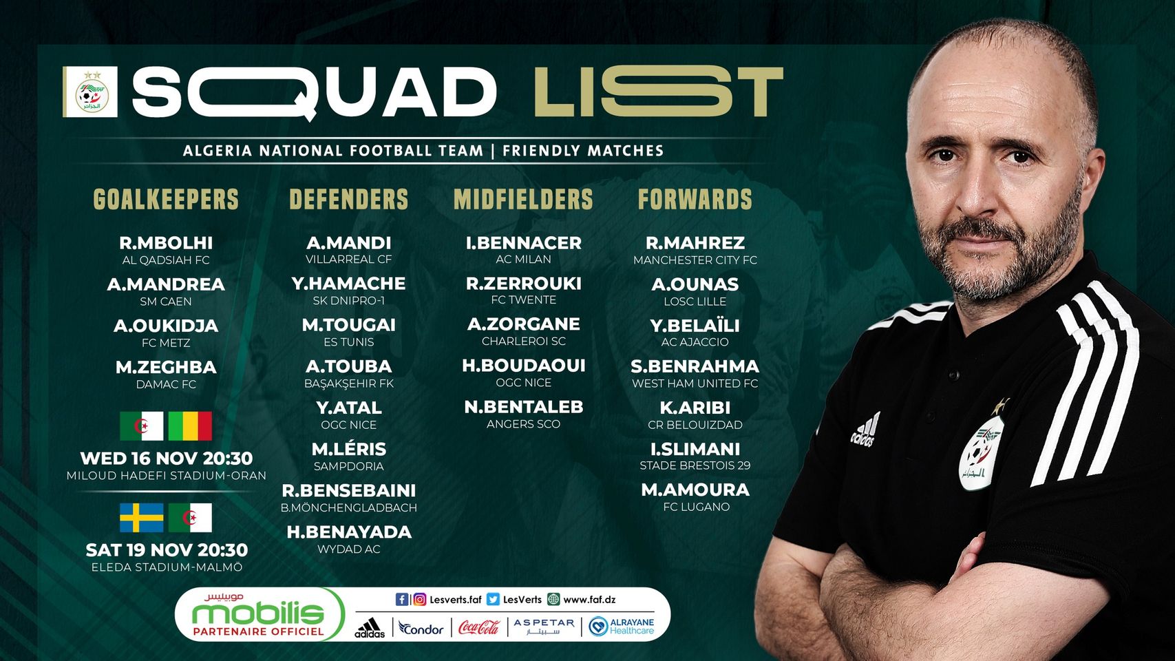 وبرز في اللائحة لاعبا لم يسبق له خوض المقابلات الدولية مع “الخضر”، وهو المغترب مهدي ليريس (24 سنة)، متوسط ميدان فريق سامبدوريا الإيطالي.
