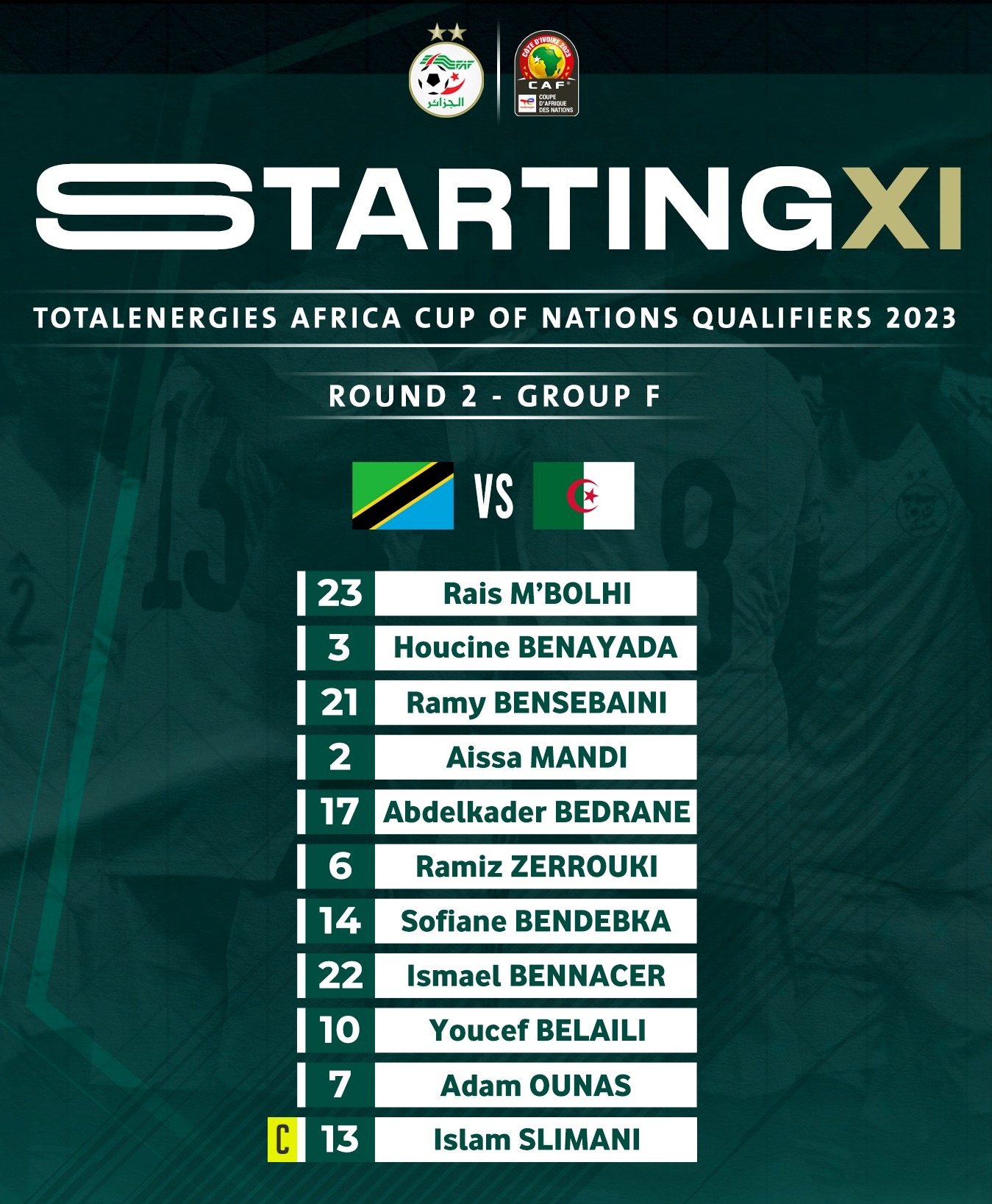 وتشكّلت لائحة اللاعبين الأساسيين للجزائر في مباراة تنزانيا، وفقا لِما يلي:
