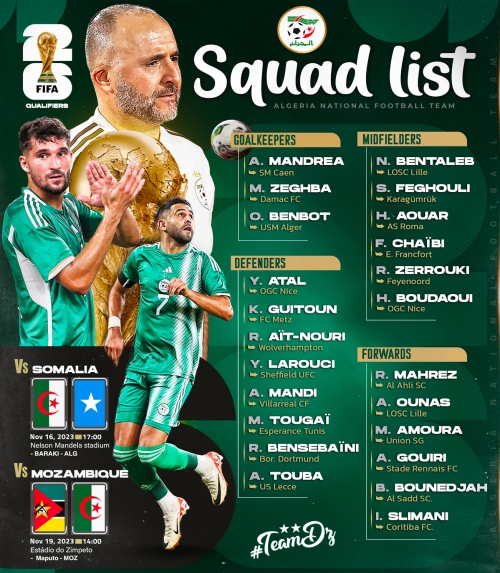 كشف النّاخب الوطني الجزائري جمال بلماضي مساء الجمعة، عن قائمة لاعبيه الذين سيُشاركون في مُواجهتَي الصّومال والموزمبيق.