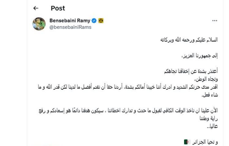قدّم اللاعب الدولي رامي بن سبعيني مساء الثلاثاء، اعتذاره إلى الجمهور الجزائري، بعد إخفاق “الخضر” في البطولة الإفريقية.