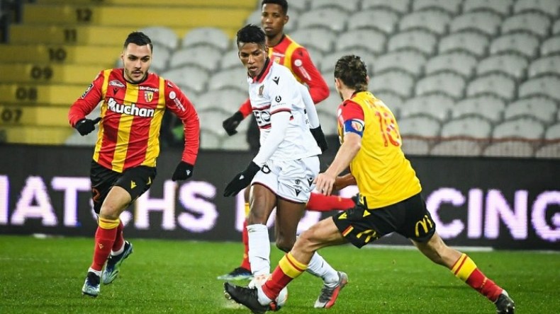 وتُظهر الصورة المُدرجة أعلاه، هشام بوداوي (في الوسط) خلال مباراة فريقه نيس والمضيف نادي لونس.