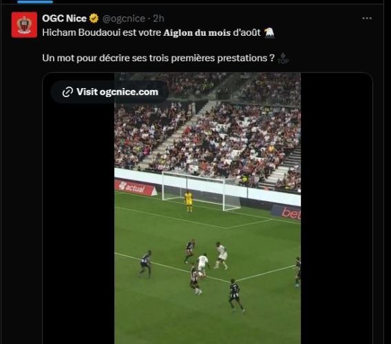 حاز الدولي الجزائري هشام بوداوي مساء السبت، الجائزة الفخرية أحسن لاعب في نادي نيس لِفترة شهر أوت الماضي.