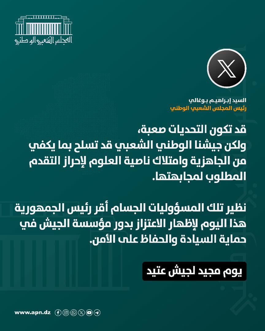 ثمّن رئيس المجلس الشعبي الوطني، إبراهيم بوغالي، في تغريدة نشرها بمناسبة اليوم الوطني للجيش الوطني الشعبي، الدور الكبير الذي تضطلع به المؤسسة العسكرية في حماية السيادة الوطنية ومجابهة التحديات الراهنة، مشيدًا بجاهزية الجيش وتسليحه بالعلم والمعرفة.