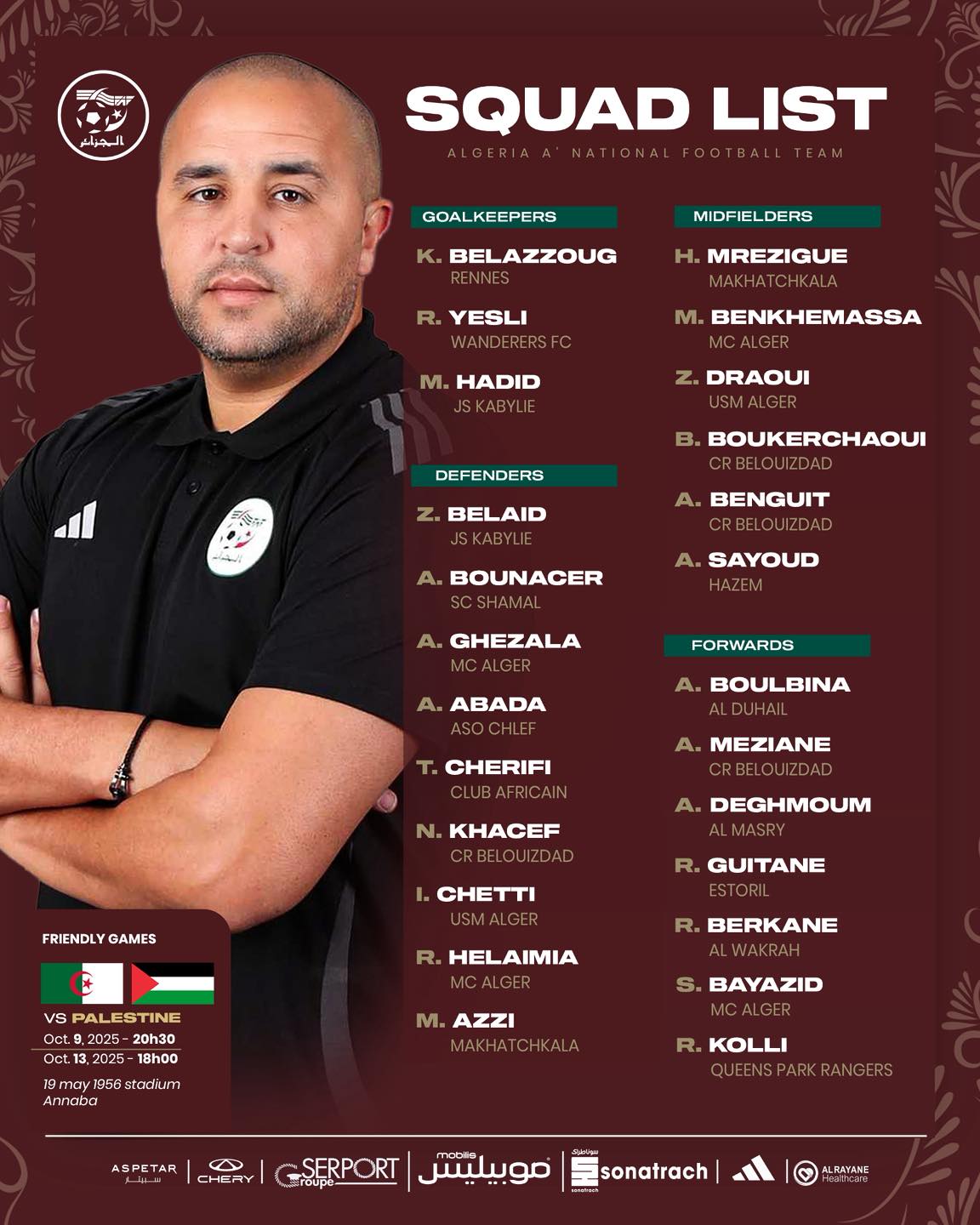 أعلن مدرب المنتخب الوطني للمحليين، مجيد بوقرة عن قائمة اللاعبين المعنيين بالمواجهة الودية المزدوجة أمام فلسطين.