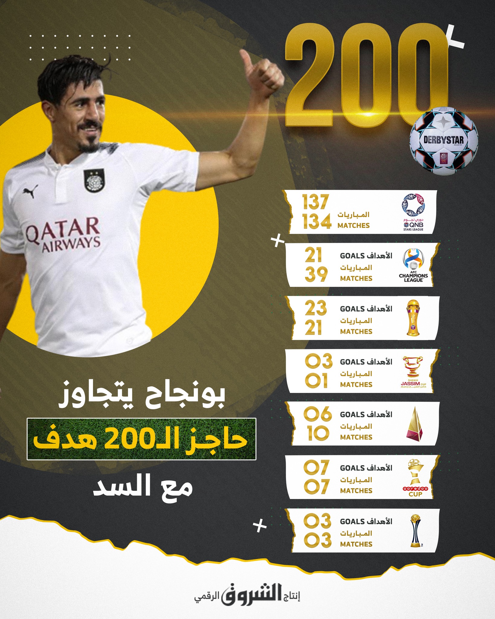 نجح الدولي الجزائري بغداد بونجاح في تجاوز عتبة 200 هدف مع ناديه السد القطري، وترسيخ اسمه في تاريخ النادي.