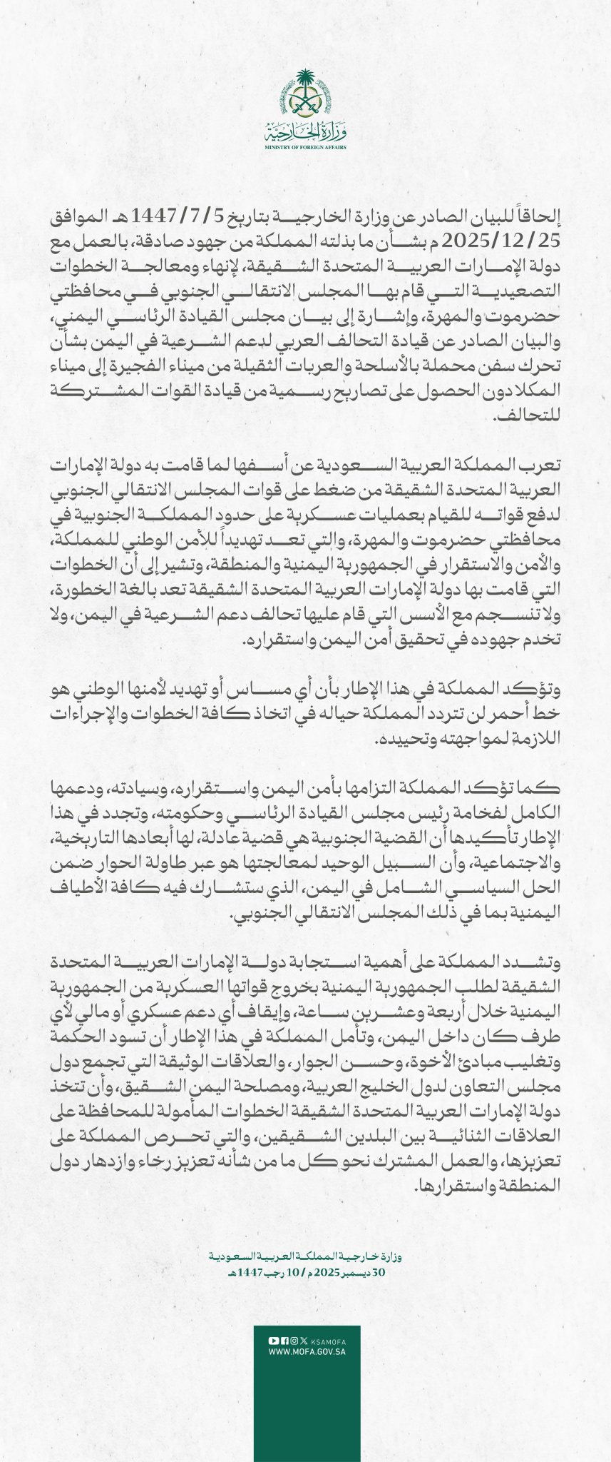 وكشفت الخارجية السعودية، أن ذلك يأتي إلحاقا للبيان الصادر عن وزارة الخارجية بتاريخ 5 / 7 / 1447هـ الموافق 25 / 12 / 2025م بشأن ما بذلته المملكة من جهود صادقة، بالعمل مع دولة الإمارات العربية المتحدة الشقيقة، لإنهاء ومعالجة الخطوات التصعيدية التي قام بها المجلس الانتقالي الجنوبي في محافظتي حضرموت والمهرة، وإشارة إلى بيان مجلس القيادة الرئاسي اليمني، والبيان الصادر عن قيادة التحالف العربي لدعم الشرعية في اليمن بشأن تحرك سفن محملة بالأسلحة والعربات الثقيلة من ميناء الفجيرة إلى ميناء المكلا دون الحصول على تصاريح رسمية من قيادة القوات المشتركة للتحالف.